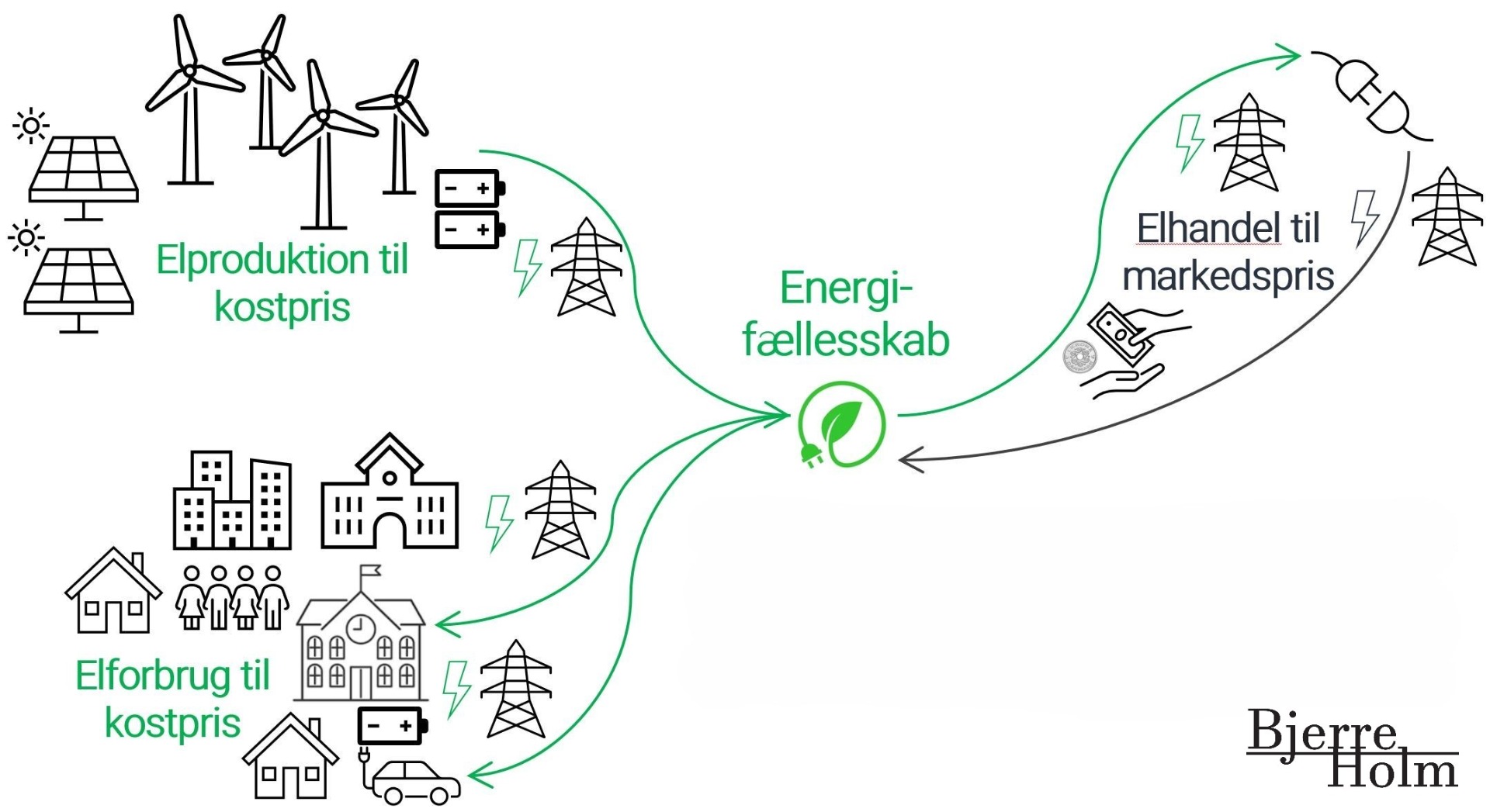 Udover lokale erhvervsvirksomheder kan lodsejere, landbrug og borgere også være med. Og sammen med kommuner kan de samle sig om deling af energi- og systemløsninger til kostpris.